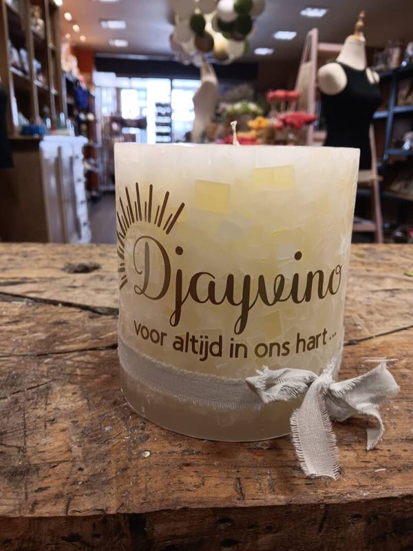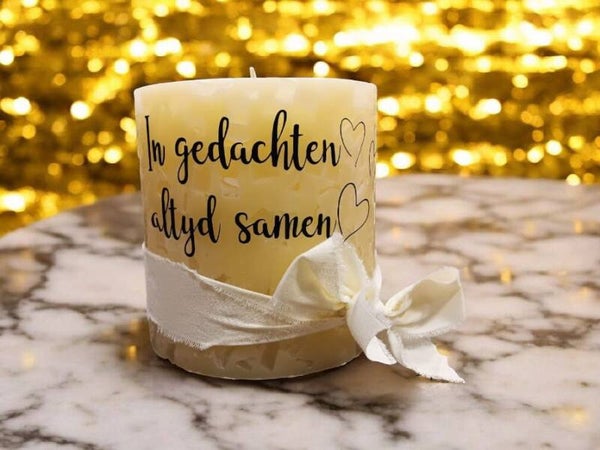 De kaars heeft een afmeting van 13 x 13 cm en wordt afgewerkt met een stijlvolle strik. De tekst kan volledig naar wens worden gepersonaliseerd – van een naam en datum tot een korte boodschap of citaat dat troost biedt.